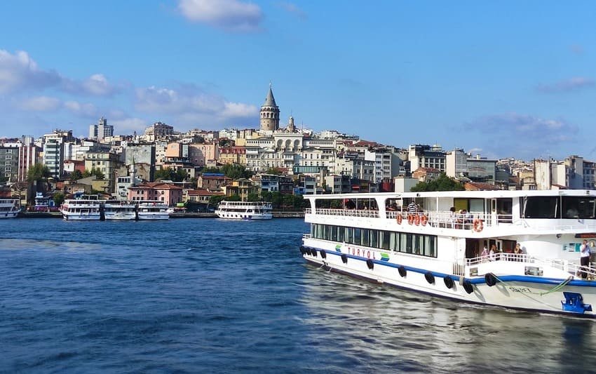 Белый паром на фоне лазурного Босфора и башни Галата — живая открытка дневного Стамбула.