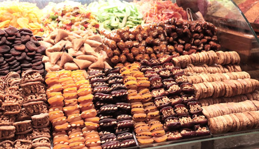 Я стою у прилавка с фаршированными сухофруктами, абрикосами и лукумом на рынке — сладостью, изобретённой в Стамбуле в 1777 году и ставшей символом турецкого гостеприимства.