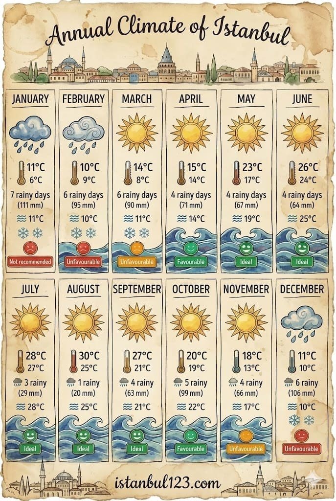 Годовой климатический гид по Стамбулу: наглядный обзор по месяцам с температурой воздуха, осадками и лучшими периодами для путешествия